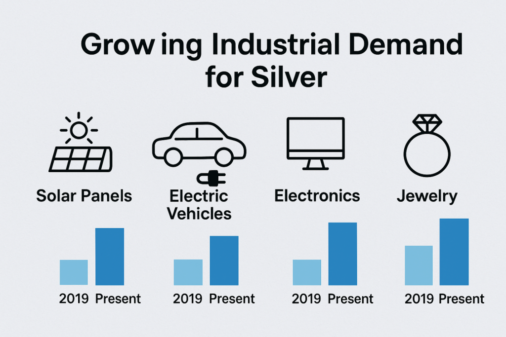 Unlike gold, silver plays a significant role in various industries. It is crucial for electronics, solar panels, electric vehicles, photography, and many industrial uses. The demand for silver in industry has increased sharply in recent years, rising from about 530 million ounces in 2019 to over 680 million ounces today. This rising demand is mainly due to the global move toward renewable energy and electric transportation. For instance, solar panels depend heavily on silver for electrical conductivity, and electric vehicles need large amounts of silver for batteries and electronics. This growing industrial need, along with limited mining output, creates a supply-demand imbalance that may push silver prices higher over time.